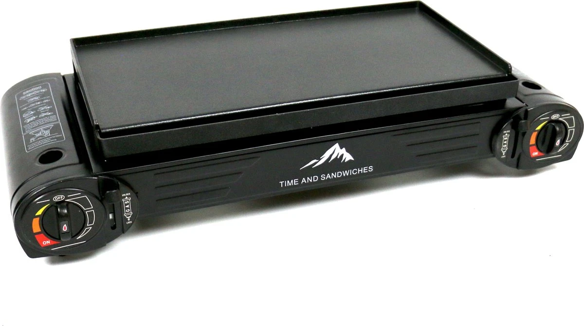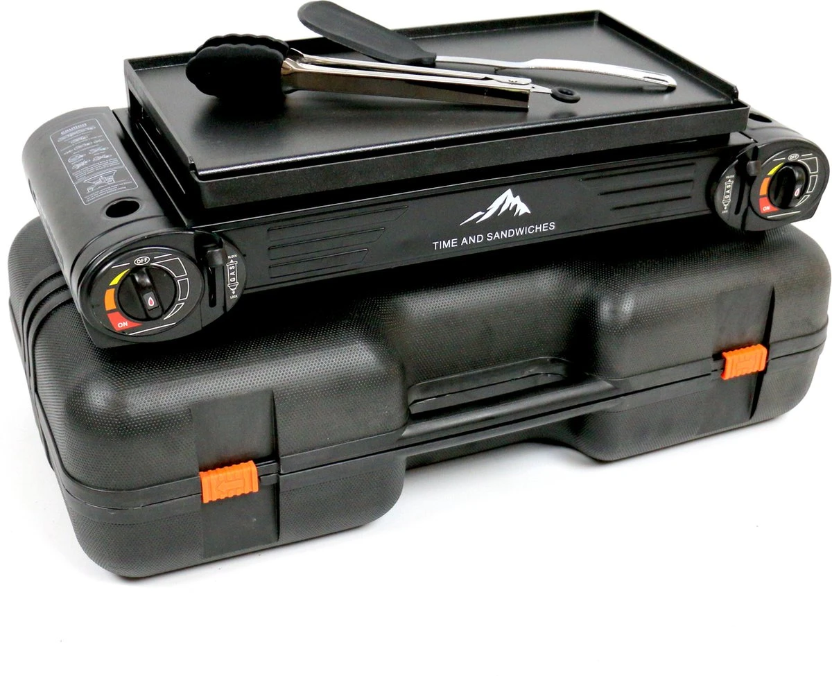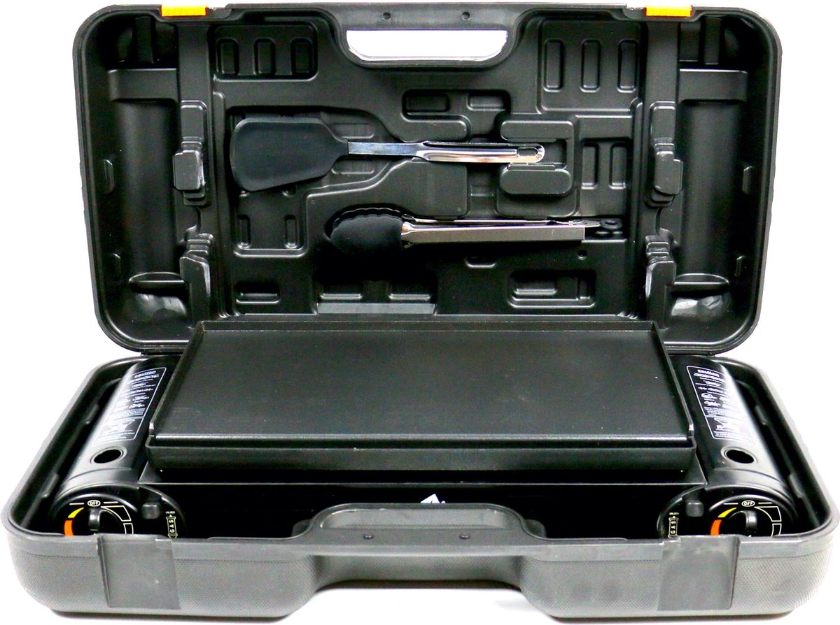 Deze zeer praktische en compacte dubbel gasfornuis set met bakplaat, komt in een stevige transportkist met spatel en tang set.